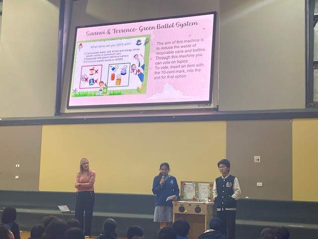 During Assembly Saanvi Shaker (Sustainability Captain) introduced Terence Pham (Yr 12) and his invention entitled Green Ballot System, which he donated to Junior School. This machine was designed with circularity in mind. Terence envisaged students being able to recycle plastic bottles and aluminium cans that can be later exchanged for cash through Victoria’s Container Deposit Scheme. Terence said that “beyond encouraging environmental responsibility, the initiative encourages students to engage in school decisions by making participation simple and accessible. It gives them a voice in matters like event themes or school improvements.”
