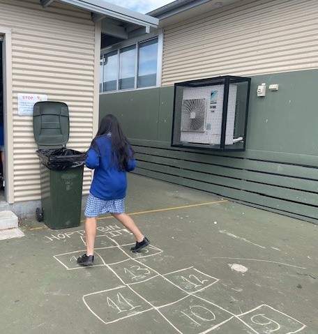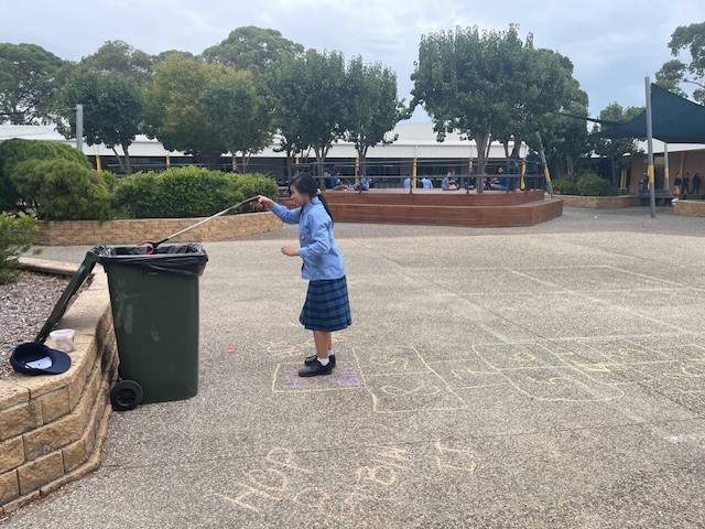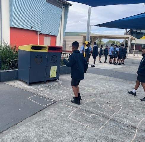 During lunchtime, students have been invited to draw a hopscotch near the bins and collect litter to play. They hopped and threw the appropriate waste in the landfill and recycling bins around the school.
